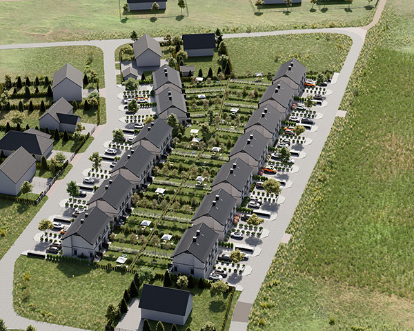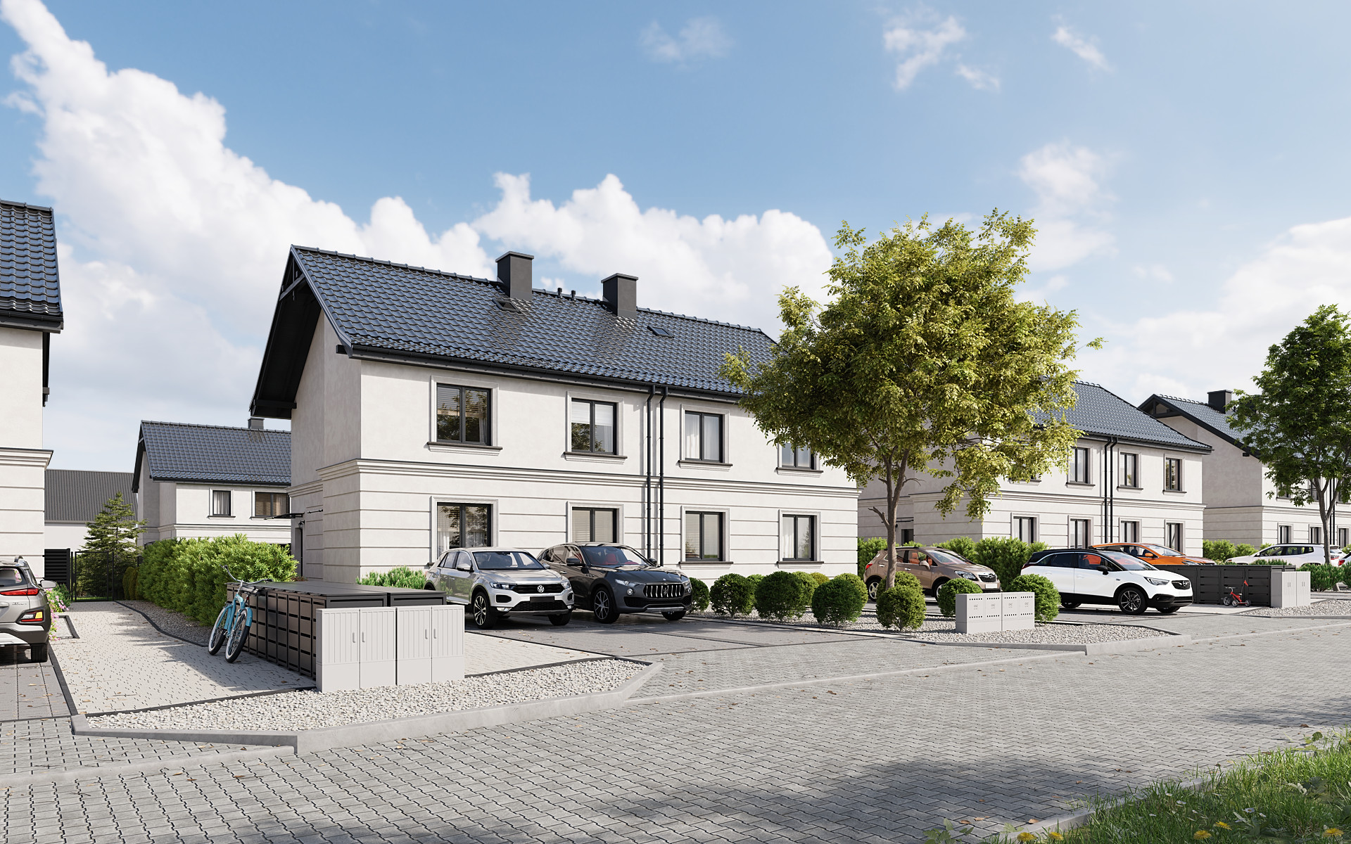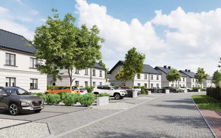 Do każdego mieszkania przynależą dwa miejsca postojowe, utwardzone kostką typu eko. Droga obok inwestycji jest oświetlona nowoczesnymi lampami solarnymi, co zapewnia komfort i bezpieczeństwo również po zmroku. Dodatkowo miejsca parkingowe mają przygotowane instalacje gotowe do montażu ładowarki dla samochodów elektrycznych. Tu naprawdę możesz myśleć o przyszłości.