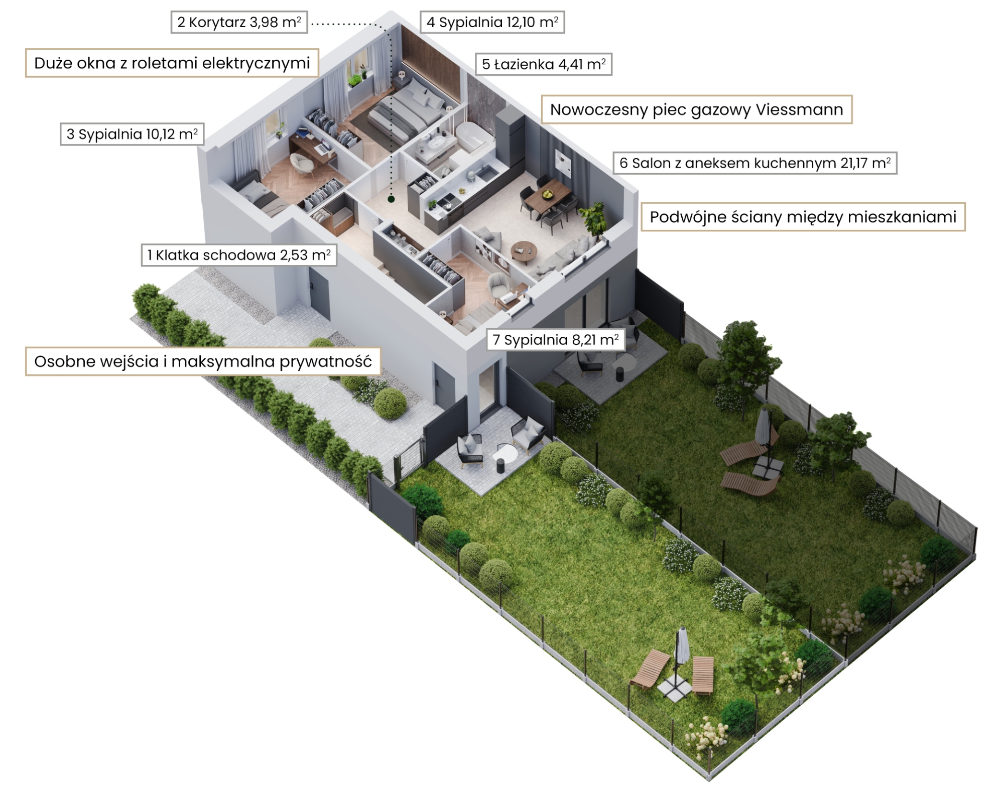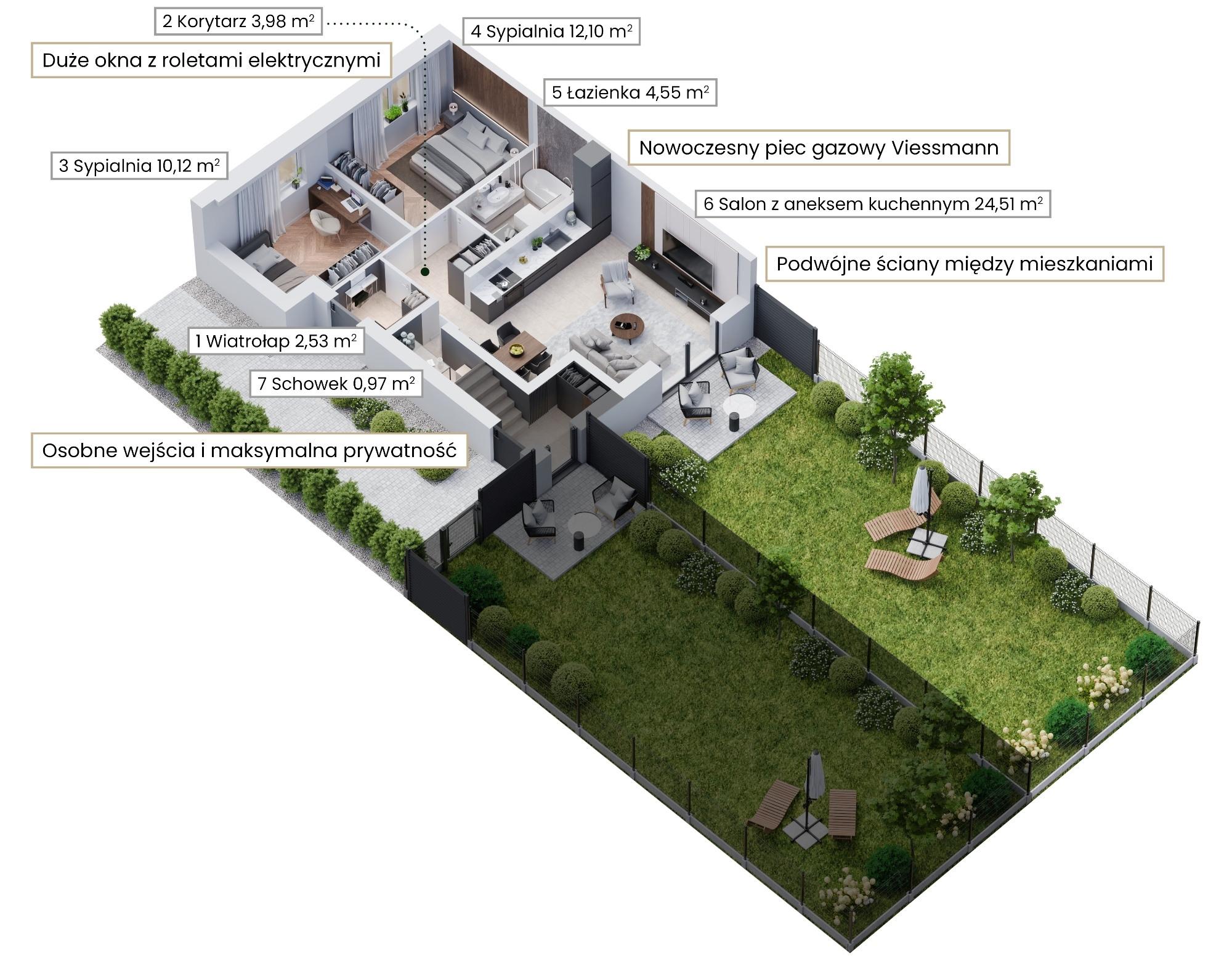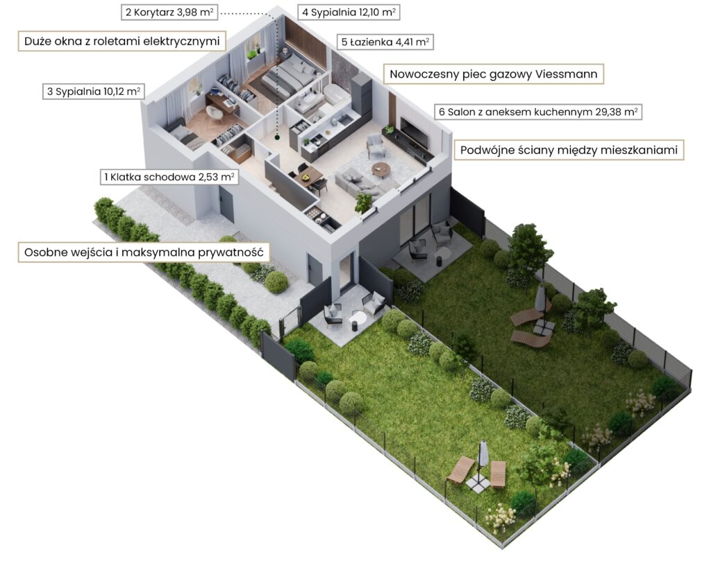 Tutaj każde mieszkanie – również te na piętrze – ma swój prywatny ogródek z tarasem i bezpośrednim wyjściem. To idealne miejsce na poranną kawę, zabawę z dziećmi czy popołudniowy relaks na leżaku. Ogródek daje Ci swobodę, której zazwyczaj nie oferuje standardowe mieszkanie – możesz urządzić tu zielony zakątek albo przestrzeń do wspólnego grillowania.