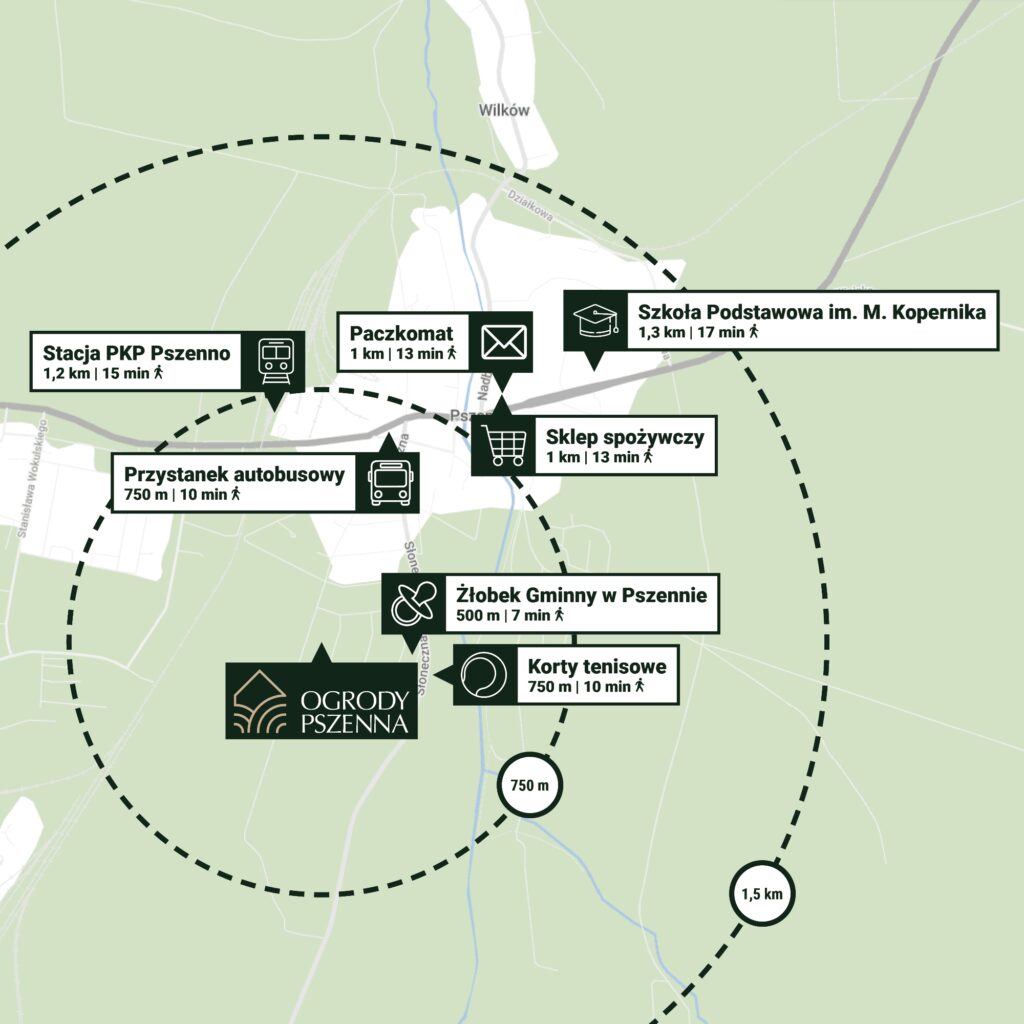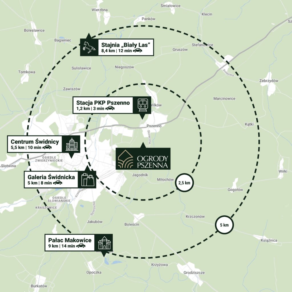Zamieszkaj w miejscu, które łączy spokój podmiejskiego życia z doskonałym skomunikowaniem. Pszenno znajduje się zaledwie 45 km od Wrocławia, a nowoczesne połączenie kolejowe pozwala dotrzeć do centrum miasta w niecałą godzinę – bez korków, bez stresu. W kilka minut dojedziesz też do Świdnicy, gdzie czekają na Ciebie wszystkie miejskie udogodnienia: sklepy, restauracje, punkt usługowe, kino, teatr, szkoły czy przychodnie. Dzięki temu możesz cieszyć się spokojem i zieloną przestrzenią na co dzień, nie rezygnując z komfortu dużego miasta.